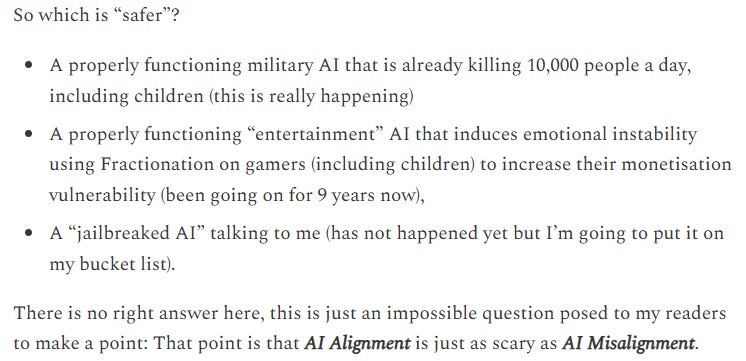Because today, now August 29th 2025, I can tell you that AI misalignment is already happening. And it’s completely undetectable by the people making it because … those people are aligned. And they live in a world where they trust alignment. They 100% could not be in the roles they are in now if either of those conditions was false. Merit is SO completely secondary to their employment, which is why I needed that USC detour to explain it.
